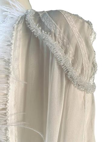 Silk see through bridal cape with Chantilly lace, applications and small clear beads.Strich Feathers on hem.