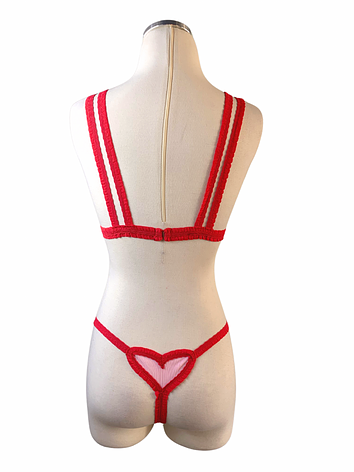 Self love reminder with this fantastic lingerie set. Made with breathable pink microfiber, and soft comfy ruffled red elastic.
