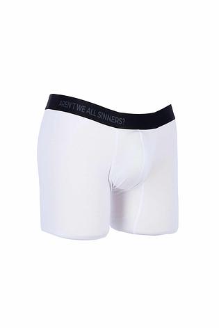 Stylish white cotton boxer brief with “AREN’T WE ALL SINNERS?” slogan on elastic band.