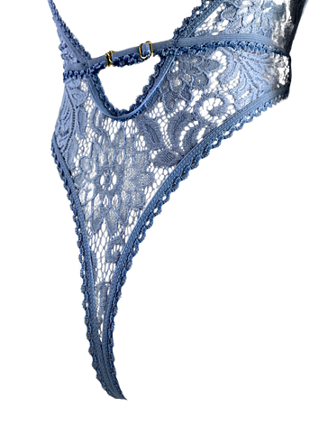 Deep cleavage baby blue stretchy floral lace bodysuit.