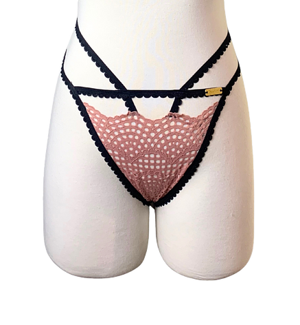 Interesting rose pink stretchy lace thong combined with black detailed elastics.