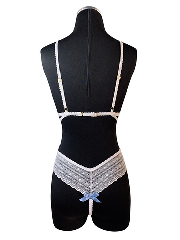 Something blue? We got you! Feminine blue bows for contrast on white floral stretchy lace. Bra is constructed with delicate adjustable straps for a better fit.