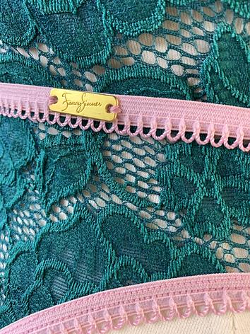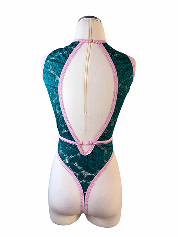 Crafted from super-stretchy floral green lace, dramatic pink elastics for a curved shape and a plunge front to make it hotter than hot.