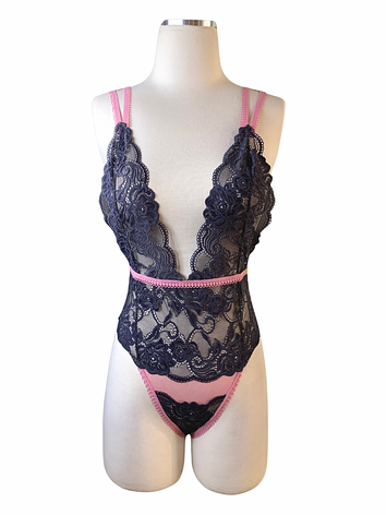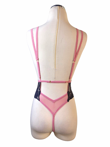 Ultra daring with a low-cut front, constructed with twilight color lace and pink mesh, for a color block, tempting and feminine look.