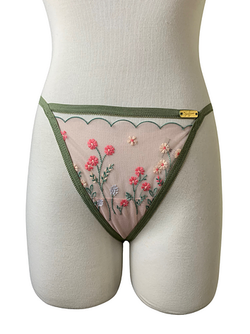 Pink floral mesh lace with Olive elastics and negative space in the back thong.