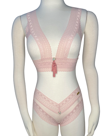 Uncovered Bralette with negative spaces in the bust with delicate and funn tassels in the center, complemented with see through mesh cheeky panties.