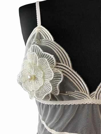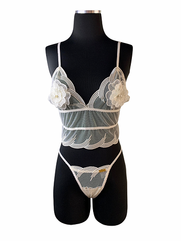 A delicate lingerie set crafted in soft ivory mesh lace and 3D flowers in the cups.