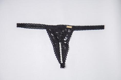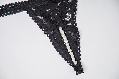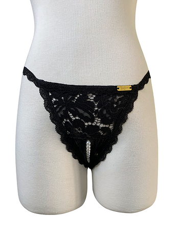Black Mermaid thong made with soft floral lace. Hand made line of pearls in the front opened side, for a sexy “under the sea” look.