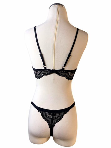This daring panty set plays with negative space in all the right places. Featuring black lace and elastics, it creates a striking effect that flatters and teases. The soft cups are detachable with center hook-and-eye closures, letting you reveal as much (or as little) as you want.