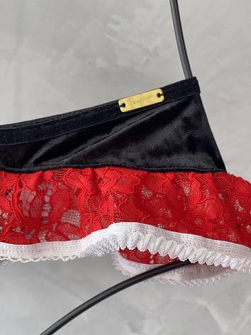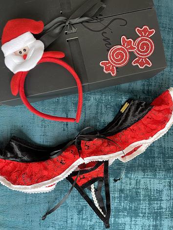 Set includes Naughty Santa Crotchless Thong with Pearls, constructed with lace, elastic velvet and a merged garter with a chic front closure.
