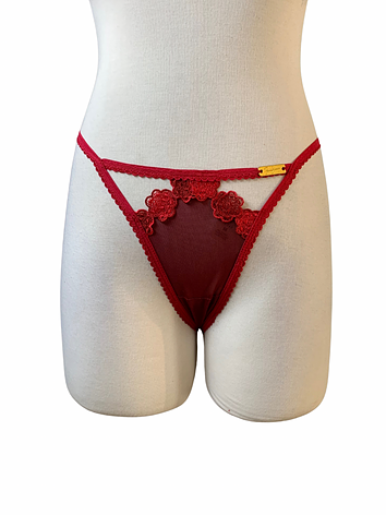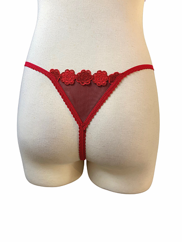 Carmesí Red Thong with beautiful floral appliqué.