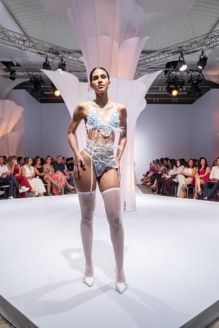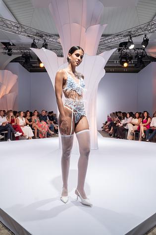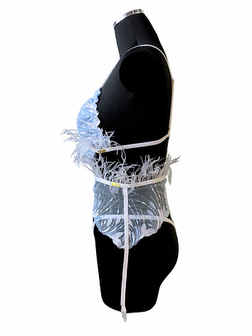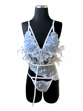 The bralette features a deep neckline and soft white feather trim that dances with every move. The high-waisted garter belt sculpts the waist, while the matching thong and coordinating blue stockings complete the enchanting look.