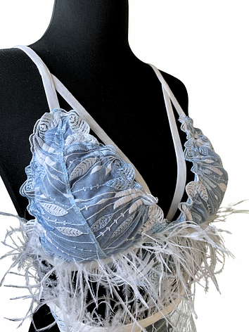 • Sheer blue lace with feather embroidery