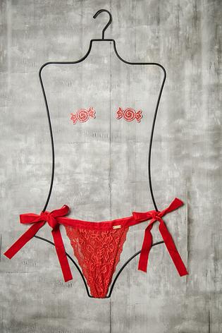 Stretchy lace fabric, with adjustable velvet straps, for a chic bow on each side of the hips.