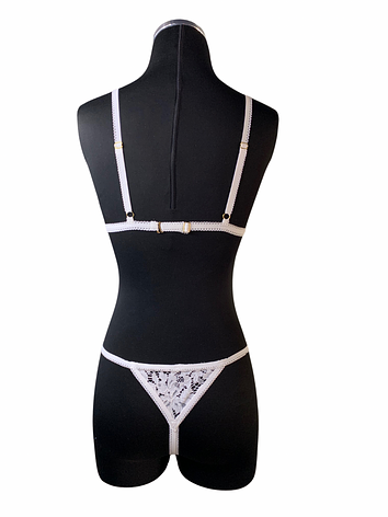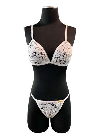 Non stretch white floral lace lingerie set and white elastics.
