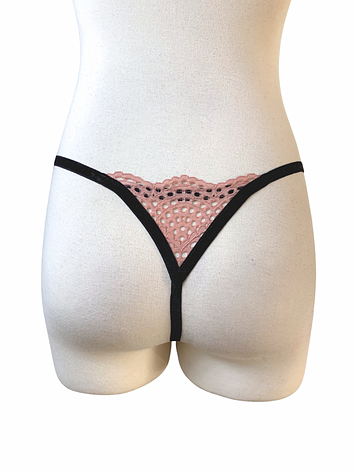 With salmon pink lace and black velvet elastics, this thong set is designed to make an unforgettable impression. Ultra-low thong and small front triangle, sits high for a leg-lengthening effect and an unapologetically cheeky vibe.