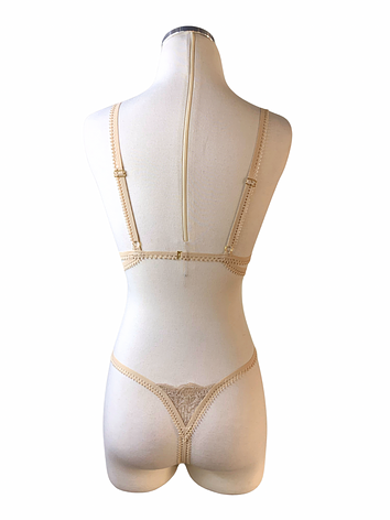 Nude floral lace, this two-piece set is designed to make an unforgettable impression. The triangle bralette offers regular coverage, while the ultra-low thong and small front triangle, sits high for a leg-lengthening effect and an unapologetically cheeky vibe.