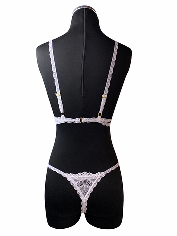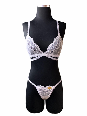 White floral lace, this two-piece set is designed to make an unforgettable impression. The triangle bralette offers regular coverage, while the ultra-low thong and small front triangle, sits high for a leg-lengthening effect and an unapologetically cheeky vibe.