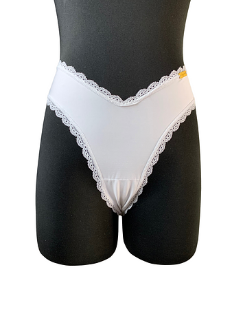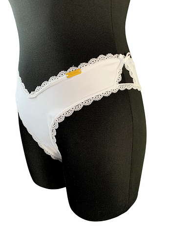 Stretchy white microfiber with textile design with triangle shape negative spaces in the sides, Cheeky panty for a comfy and feminine look.