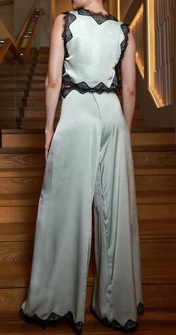 Effortless glamour with a modern edge. The "Odette" set is a stunning study in contrasts, featuring a shimmering, mint-green satin that drapes like a dream. The top is a refined, high-neck piece framed by exquisite, black Chantilly lace appliqué that defines the silhouette. It pairs perfectly with our high-waisted, wide-leg trousers, which echo the lace trim at the hem for a sophisticated, flowing look from head to toe. This is the ultimate ensemble for the modern host or an elegant evening out.